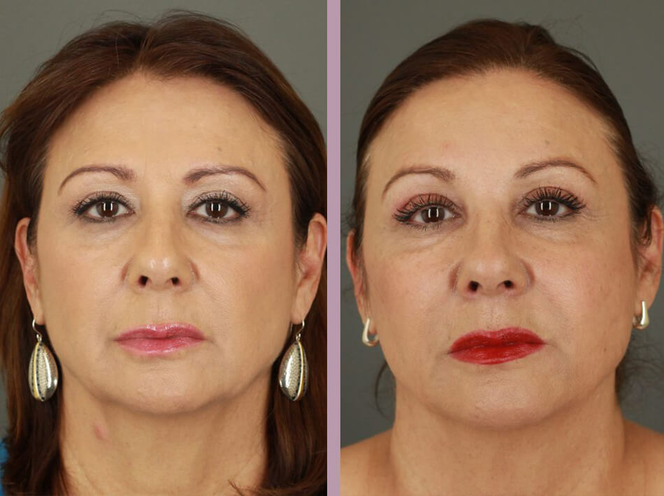This is a 61 year-old female that was desirous of facial rejuvenation. She disliked the gravitational changes she had seen in recent years, but did not have the time for a facelift recovery. Dr. Flint performed an upper blepharoplasty, and at the same time used 2 syringes of Juvederm Ultra Plus to her nasolabial folds and marionette lines, 1 syringe of Juvederm Ultra to the area between her eyebrows and also the corners of her mouth, and 3 syringes of Voluma to her midface to help replace volume. Botox was also used in the crow's feet area, tail of the brow, and in between her eyebrows. Her post-operative photos were taken two months following her procedures.