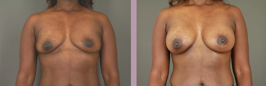 This is a 45 year-old who was an A-plus to a B-minus and desired to be a full B without padding. She breastfed and disliked the loss of upper pole fullness, but specifically stated she did not want to be too large. She reported that her right breast was slightly larger than her left breast. A 265 cc smooth silicone gel implant was used on the right and a 286 cc smooth silicone gel implant was used on the left. Her post-operative photos were taken four months following her surgery.