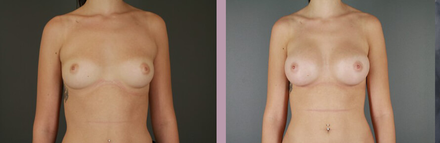This is a 22 year-old who desired larger breasts. She was wearing a B to C cup and desired to be a D cup. Moderate plus profile silicone implants were selected. Her post-operative photos were taken five weeks following her procedure.