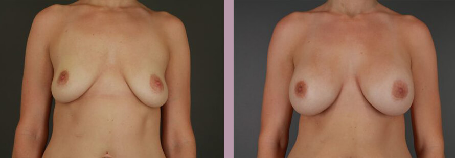 This is a 32 year-old female who felt self conscious about her lack of cleavage. She reports her breast are slow set, but she was not desirous of a breast lift. Dr. Flint performed a breast augmentation. Her post-operative photos were taken six months following her surgery.