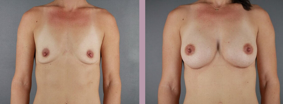 This is a 35-year old female who desired breast augmentation. She was an A-cup and desired to be a C-cup. She is very active and was worried about going too large with implants. Prior to the procedure her right breast was slightly larger. Dr. Flint performed silicone augmentation with 360cc on the right breast and 375cc on the left. Her post-operative photographs were taken three months after the procedure.