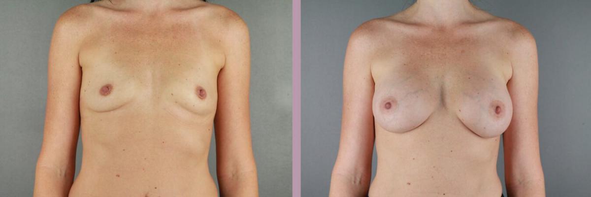 This is a 32 year-old female who desired breast augmentation. After having three children she did not feel droopy but did feel she was slightly asymmetric. She was an A cup and desired a C cup. Dr. Flint performed breast augmentation using Moderate Profile 330cc on the right breast and 360cc on the left breast. Her post-operative photographs were taken four months following her procedure.