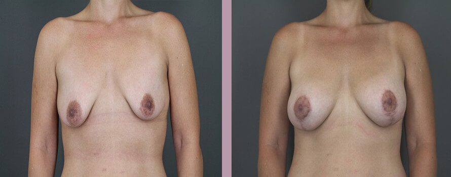 This is a 43 year-old who underwent lap-band surgery in 2010, followed by a 75 pound weight loss. She is 5'5 and weighs 145 pounds. She underwent a breast augmentation with a breast lift. Silicone moderate plus profile implants were selected. She is 300 cc on the right and 325 cc on the left side. Her post-operative photos were taken nine months following her surgery.