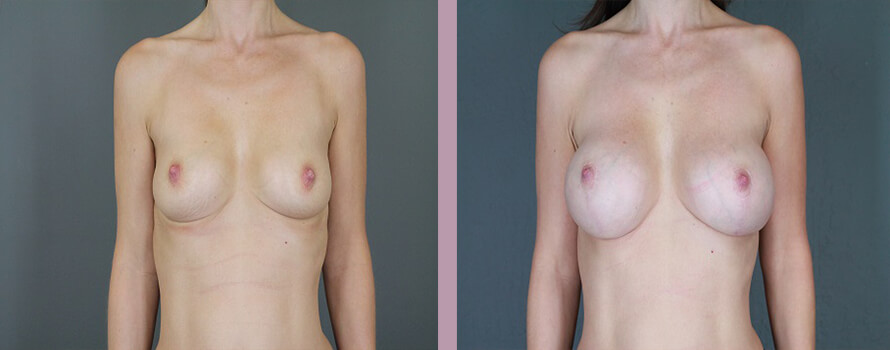 This is a 47 year-old who desired more upper pole fullness in her breasts and to relieve herself of the lax skin on her breasts. She is 5'1 and weighs 100 pounds. She underwent a breast augmentation and mastopexy. Her post-operative photos were taken none months following her surgery.