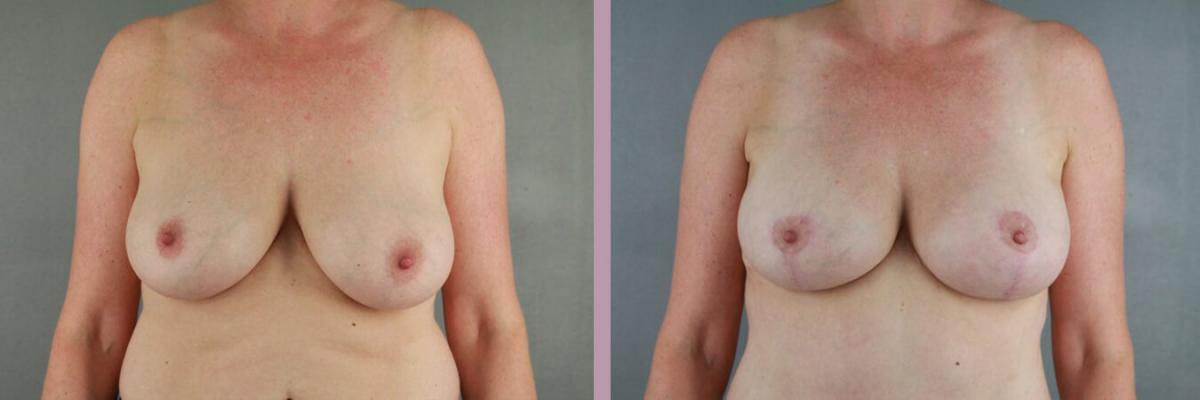 This is a 44-year-old female who desired smaller, better shaped breasts. She reported her breasts were asymmetric and saggy. Dr. Flint performed an anchor shaped breast lift and placed low profile implants under the muscle for shape preservation. Her post-operative photos were taken four months post procedure.