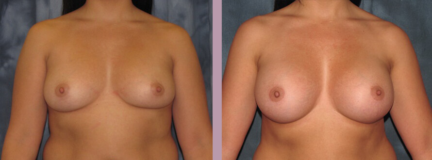 This is a 25 year-old who desired breast augmentation. She was an A plus to B minus cup, but preferred the look in her padded D cup bra. High profile silicone implants were selected. She is 275 cc on the right side and 300 cc on the left. Her post-operative photos were taken four months following her surgery.