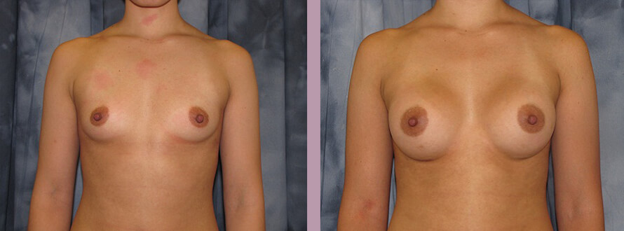 This is a 22 year-old who was an A minus cup and desired a full C cup. Her post-operative photos were taken four months following her surgery.