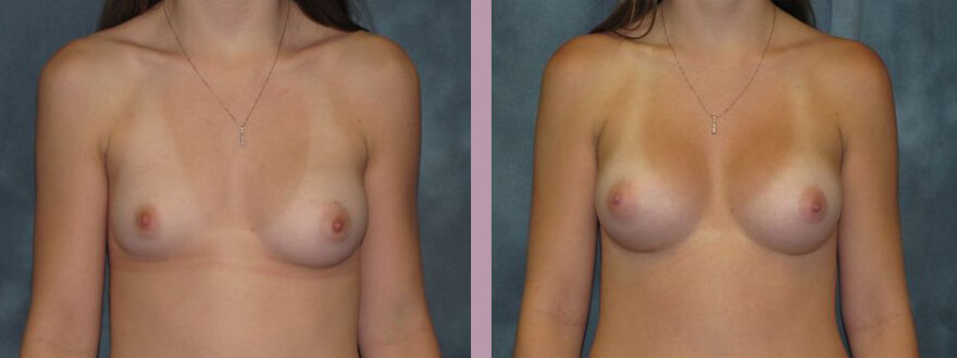 This woman is 5'3 and 115 pounds. She underwent breast augmentation to correct asymmetric breast size and shape. High profile silicone implants were used. Her left side implant is 180 cc and right side implant is 280 cc.