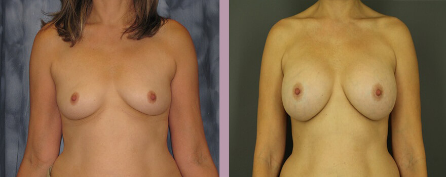 This is a 44 year-old who desired breast augmentation. She was a B minus cup and preferred to be a large C cup. Moderate Plus 375 cc implants were selected. Her post-operative photos were taken six months following her surgery.