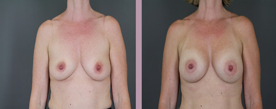 This is a 49 year old who was unhappy with the upper pole fullness loss in her breasts. She was happy with her nipple position and did not want to be dramatically larger. She elected not to undergo a breast lift as she did not want to have the scar associated with the procedure. She is 5'5 and weighs 140 pounds. She underwent a breast augmentation with silicone implants. She is 170 cc on the left and 200 cc on the right side.
