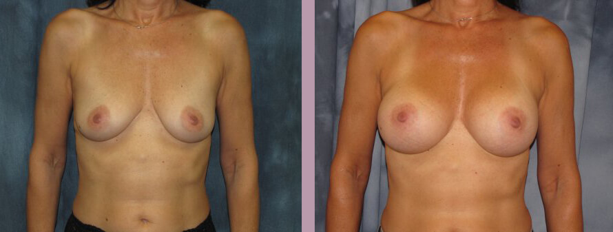 This 52 year-old was a B-minus and after breastfeeding and desired to be a full B cup. She is 5'6 and 125 pounds. She underwent a breast augmentation with 300 cc silicone implants. Her post-operative photos were taken eleven months following her procedure.