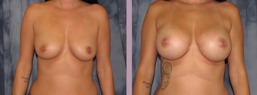 This is a 32 year-old who desired breast augmentation. She is 5'6 inches and ranges between 125-135 pounds. She wanted fuller breasts, as she felt her breasts didn't match her hips. Moderate profile silicone 275 cc implants were selected. Her post-operative photos were taken four months following her surgery.