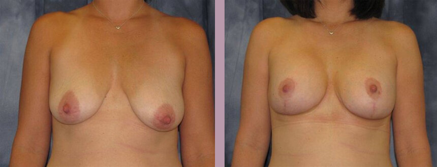 This 39 year-old female desired more fullness and better shape. A breast augmentation and lift were performed with 300 cc implants.