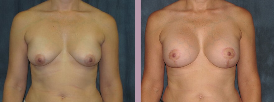 This 44 year-old female is 5' 5 and 143 pounds. She desired to enlarge her breasts from an A cup to a C cup. She breast fed and also wanted to improve her nipple position. She had a breast augmentation with a breast lift with 300 cc silicone implants. Her post-operative photos were taken three months following her procedures. She will continue to see improved scarring over the course of a year.