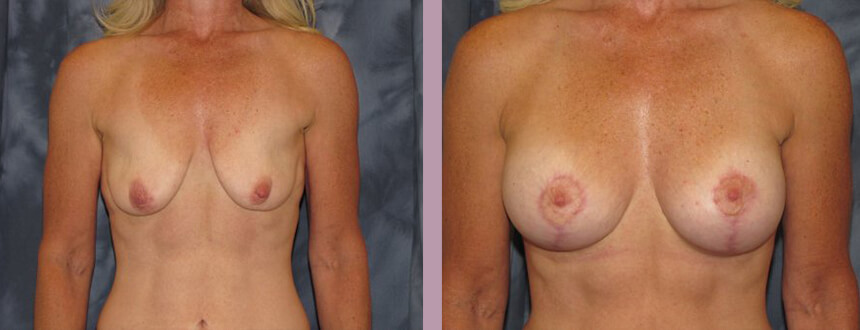 This female is 5' 1 and weighs 108 pounds. She recently lost 30 pounds and disliked the loss of volume in her breasts. She desired a C-cup. A breast augmentation and breast lift were performed with 300 cc silicone implants. Her post-operative photos were taken six months following her procedures.