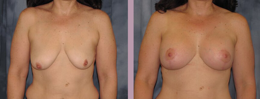 This is a 44 year-old female who desired a breast augmentation with a breast lift. She was a B cup and desired a C cup. She is 5'0 and weighs 130 pounds. She underwent a breast augmentation, mastopexy, and liposuction of her axillae. High profile silicone implants were selected. The right implant is 300 cc and the left implant is 325 cc. Her post-operative photos were taken 4 months following her surgery.
