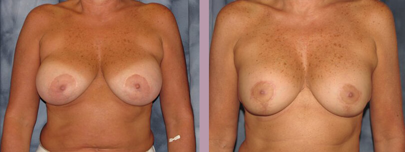 This 5'6 165 pound female had saline breast implants placed by another surgeon 14 years ago. She desired to have slightly smaller and better shaped breasts. She had a breast lift along with an implant exchange using 240 cc silicone implants. Her post-operative photos were taken one year following her procedures.