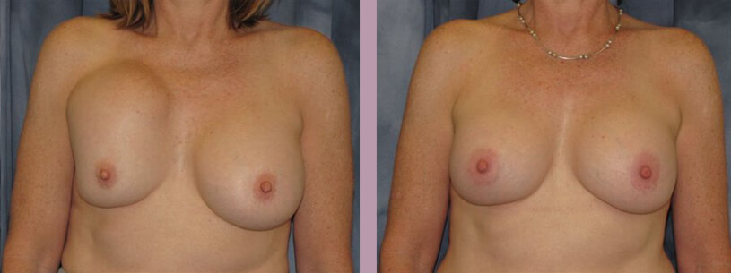 This patient had saline implants used in a breast augmentation with another surgeon 15 years ago. She developed capsular contracture of her right breast. Dr. Flint replaced her implants with high profile silicone implants sizes 280 cc on the right and 325 cc on the left.