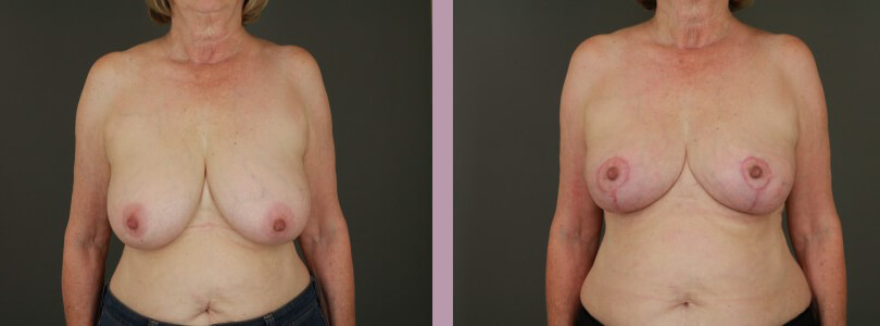 This is a 68 year-old that desired a breast reduction. She was a double D cup and desired to be a C cup. A breast reduction was performed. Her post-operative photos were taken four months following her procedure. Her scars will continue to heal nicely over the course of the year.
