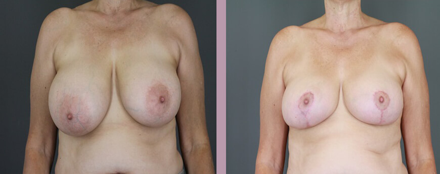 This is a 57 year-old who desired a breast reduction. She was wearing a double D cup and desired a dramatic reduction. She is 5'7 and 170 pounds. She underwent a breast reduction. Her post-operative photos were taken four months following her surgery.