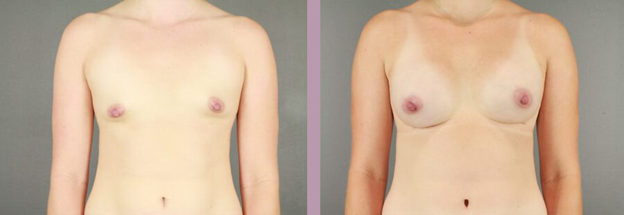 This is a 28 year-old female who desired a breast augmentation. She reported even when she was pregnant she did not fill an A-cup. Upon examination Dr. Flint found she had underdeveloped inferior pole of both breasts, poorly defined folds under her breasts, and mild lipodystrophy. Dr. Flint recommended and performed a breast augmentation with lowering of her left fold along with liposuction of her axilla (commonly known as the armpit region). Her post-operative photos were taken six months following her surgery.