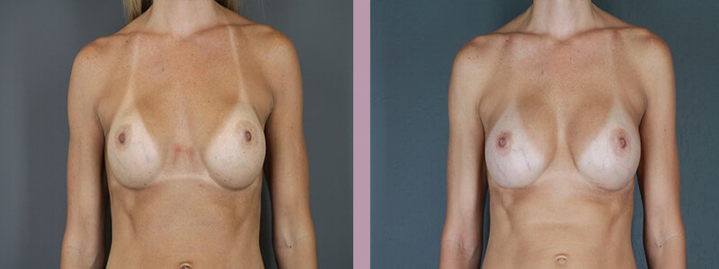 This is a 44 year-old who desired an implant exchange with larger silicone implants. She had saline implants that were placed 16 years ago. She was a B cup and desired a D cup. She underwent an implant exchange with Strattice placement. Moderate plus profile 500 cc silicone implants were selected. Her post-operative photos were taken four months following her surgery.