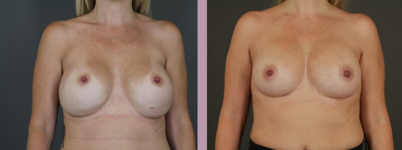 This is a 39 year-old female who underwent saline breast augmentation in 2001 with another physician. She reported that she had lost 20 pounds and could feel the rippling in both of her breasts. She also reported that she felt her left implant was sliding out to the side. Dr. Flint recommended an implant exchange with a slightly smaller silicone implant along with Strattice to help minimize the rippling and decrease the risk of recurrent malposition. Her post-operative photos were taken ten months following her surgery.