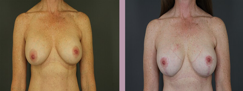 This is a 57 year-old who disliked her painful, firm breasts. She wanted to be downsized modestly, but not so dramatically that she needed to change her entire wardrobe. She was wearing a double D and also felt her breasts were too wide. She is 5'6 and weighs 135 pounds. She underwent an implant exchange with 300 cc silicone implants, breast lift, and Strattice placement. Strattice was used in her case to prevent recurrence of her severe breast firmness due to capsular contracture. Her post-operative photos were taken one year following her surgery at which point her breasts remained very soft.