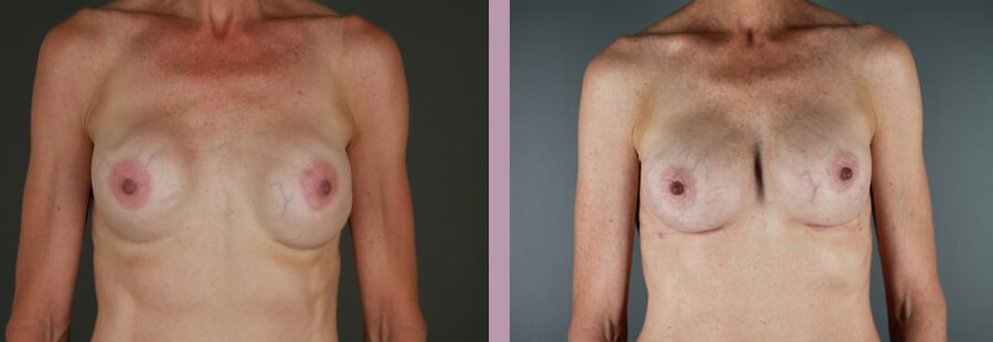 This is a 52 year-old who had saline breast augmentation in 1989 with another surgeon. She went from a double A to a C cup. In 2001 she had a capsular contracture that caused her to have an implant exchange. She wished to improve the rippling and distance between her implants. Dr. Flint recommended and performed an implant exchange with Strattice to help mask the rippling and help the malposition of her breasts. Her post-operative photos were taken six months following her surgery. Her breast position will continue to improve throughout the course of the first year.