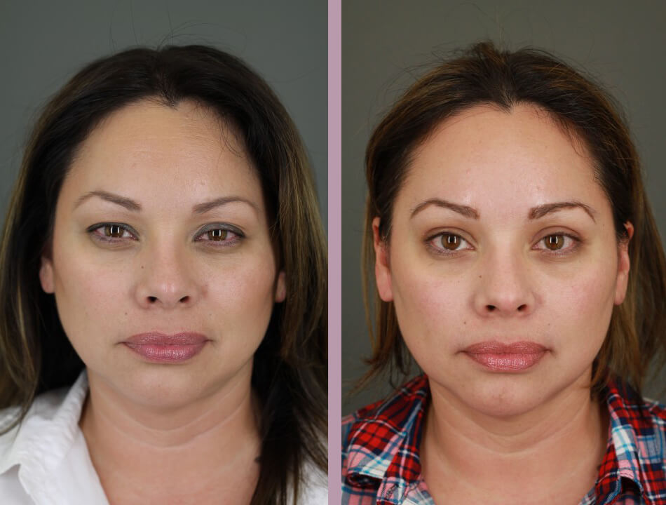 This is a 46 year-old that disliked her heavy upper lids. She had an upper eyelid lift along with 28 units of Botox in between her eyebrows and to her procerus (the bunny lines on the nose). Her post-operative photos were taken two months following her procedure.