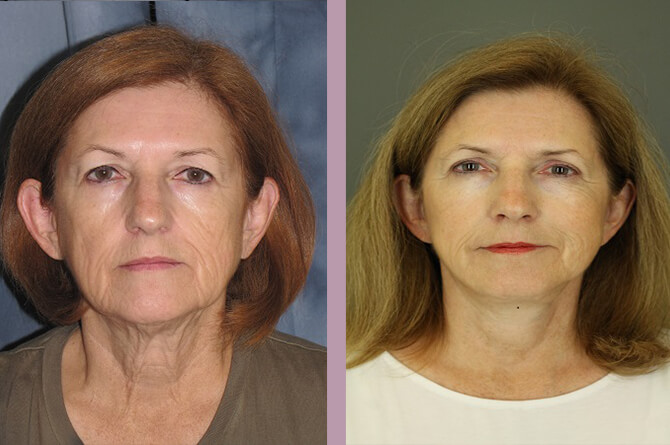 This is a 62 year-old who disliked her heavy upper eyelids and marionette lines. She had recently lost 25 pounds and felt most of it came from her face. She underwent a facelift, upper blepharoplasty and three syringes of Juvederm ultra plus to her nasolabial folds and marionette lines. Her post-operative photos were taken one year following her surgery.