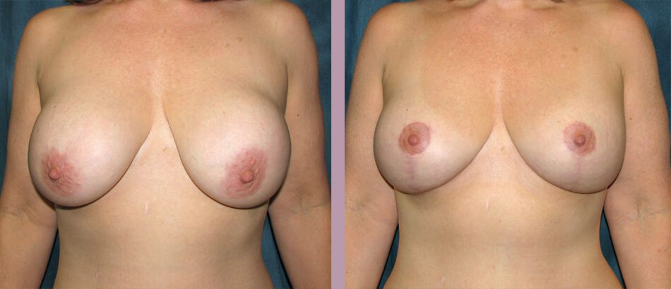 This is a 47 year-old female that had undergone breast augmentation 17 years ago with another doctor. She reported over time her breasts had become more spherical in shape. She was a DD cup and overall liked her size, but wanted better shape and also desired a lift. An implant exchange along with a mastopexy was performed. Her post-operative photos were taken one year following her surgery.