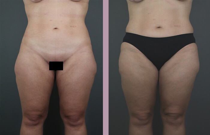 This is a 43 year-old who had lap-band surgery in 2010, followed by a 75 pound weight loss. She is 5'5 and weighs 145 pounds. She underwent liposuction of her knees and inner and outer thighs. Her post-operative photos were taken nine months following her surgery.