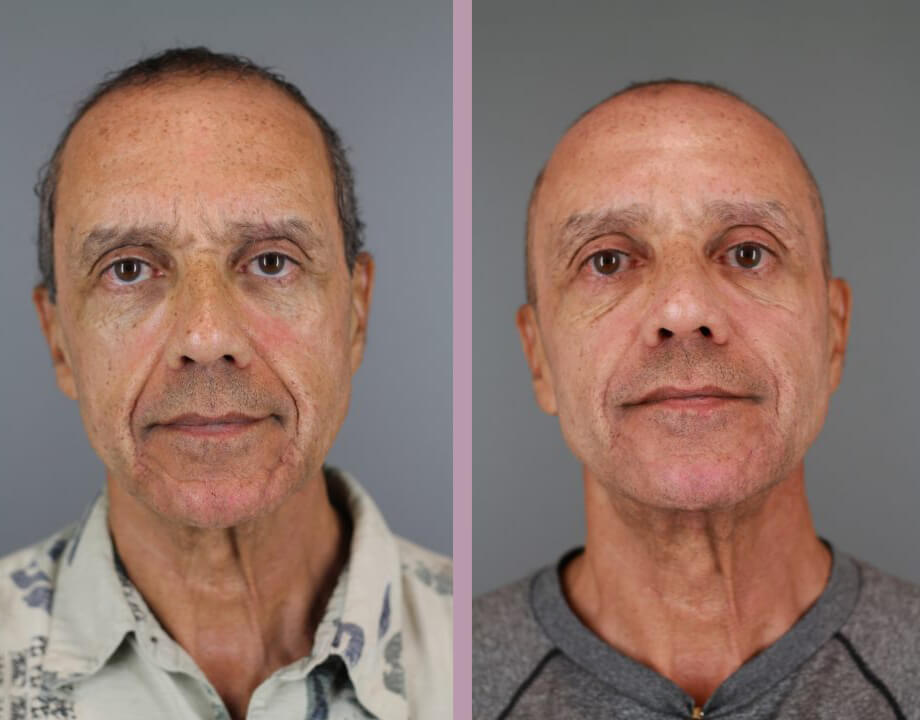 This is a 64 year-old male who reported his face looked angry, and he wanted to soften it. He had never had any Botox or filler treatment before. Dr. Flint recommended Botox treatment to his crow's feet, between his eyebrows, and to the corners of his mouth. He also had three syringes of Juvederm put in his nasolabial folds, oral commissures, and the crevices in his chin. His post photos were taken three weeks following his injections.