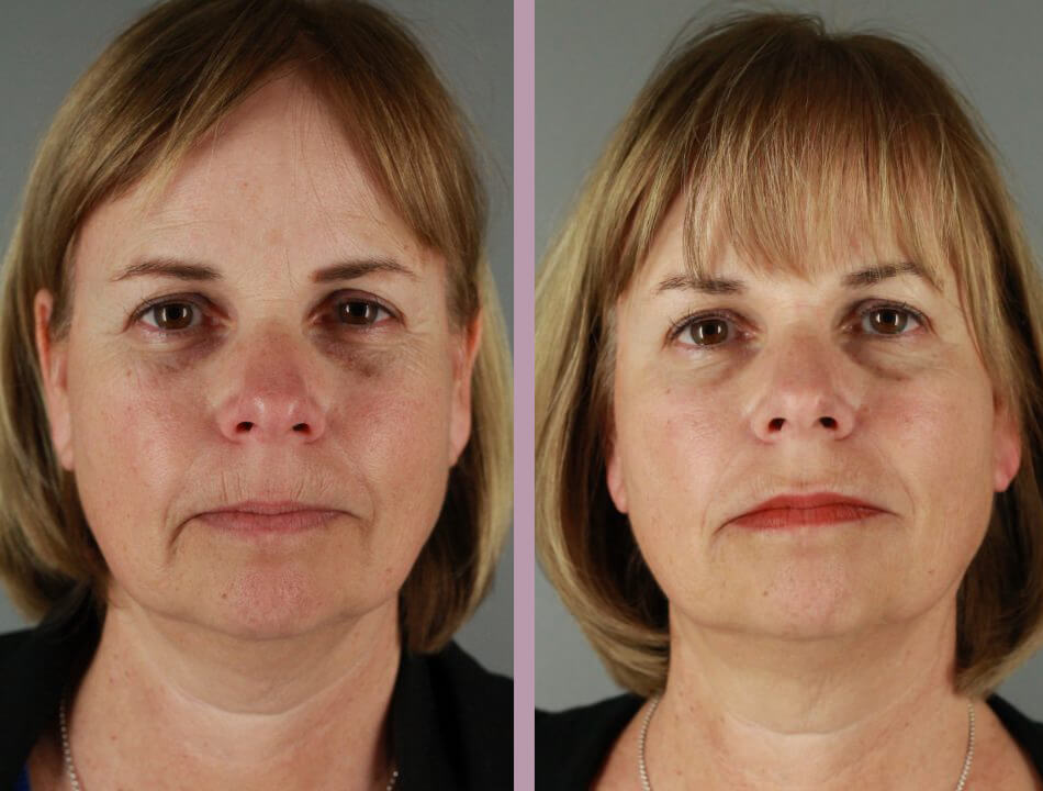 This is a 58 year-old who desired improvement to her lip lines and overall facial rejuvenation. She had never had any type of filler or Botox treatments before. Dr. Flint recommended a conservative plan and used 1 syringe of Volbella around the lip lines, 1 syringe of Juvederm that was placed in between her eyebrows and the corners of her mouth, and Botox in between her eyebrows, crow's feet, and tail of her eyebrows. Dr. Flint also placed her on a SkinCeuticals regimen to help with anti-aging. Her photos were taken three weeks following her treatment.
