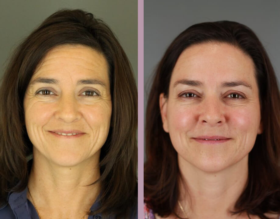 This is a 46 year-old that came to see Dr. Flint to discuss the wrinkling around her mouth and forehead. Dr. Flint customized a plan that included a SkinCeuticals medical grade skin care regimen, Botox, and filler to help slow the signs of aging. She recommended and used two syringes of Voluma in her mid-face. Two syringes of Juvederm Ultra Plus were used in the nasolabial folds and the lines around her mouth. Botox was also used in her forehead, between her eyebrows and at the tail of the eyebrow, to the crow's feet, and to the muscles at the lower corner of her mouth. The frontal profile photo was taken four years prior to any treatments and her post photo shows how the treatments have reversed her aging. The three other photos were taken 9 months following her treatments.